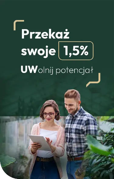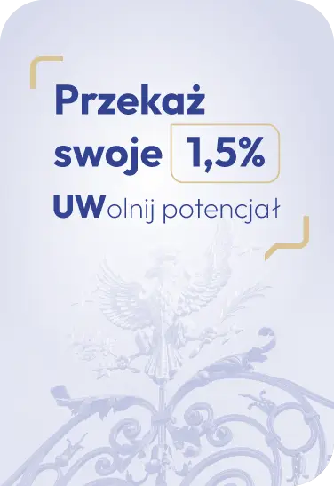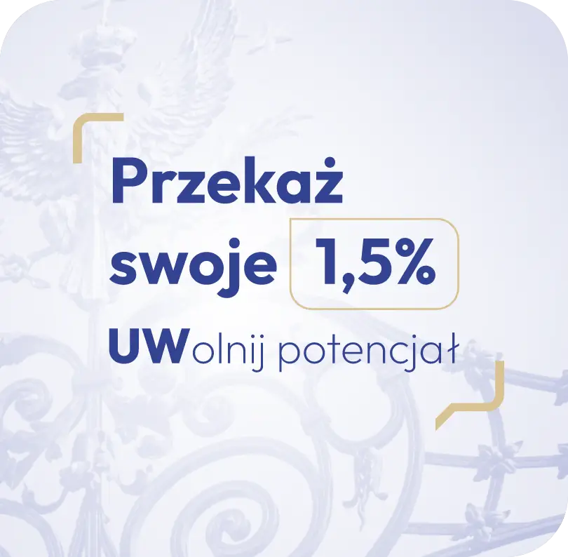 Przekazując 1,5% podatku, inwestujesz w talenty i przyszłość nauki – tam, gdzie Twój wkład naprawdę robi różnicę. Twoje 1,5% zostaje na UW! Fundacja Uniwersytetu Warszawskiego wspiera rozwój nauki, edukacji i innowacji na naszej uczelni. Dzięki FUW studenci i młodzi naukowcy otrzymują stypendia, mają dostęp do nowoczesnych laboratoriów i mogą realizować przełomowe projekty badawcze. Przekazując 1,5% podatku, inwestujesz w talenty i przyszłość nauki – tam, gdzie Twój wkład naprawdę robi różnicę. Twoje 1,5% zostaje na UW! Fundacja Uniwersytetu Warszawskiego wspiera rozwój nauki, edukacji i innowacji na naszej uczelni. Dzięki FUW studenci i młodzi naukowcy otrzymują stypendia, mają dostęp do nowoczesnych laboratoriów i mogą realizować przełomowe projekty badawcze. 3 proste kroki Siedziba i adres do korespondencji: Fundacja Uniwersytetu Warszawskiegoul. Krakowskie Przedmieście 26/2800-927 Warszawa Lokalizacja Biura Fundacji: „Domek Ogrodnika”, pok. 1.4ul. Dobra 68/7000-312 Warszawa tel. +48 22 552 08 82 fax: +48 22 826 79 48 e-mail: fundacja@fuw.pl NIP: 525–15–69–220 Regon: 001323248 nr KRS: 0000218937 Bank Millennium S.A. 73 1160 2202 0000 0006 8162 0527 Siedziba i adres do korespondencji: Fundacja Uniwersytetu Warszawskiegoul. Krakowskie Przedmieście 26/2800-927 Warszawa Lokalizacja Biura Fundacji: „Domek Ogrodnika”, pok. 1.4ul. Dobra 68/7000-312 Warszawa tel. +4822 5520882fax: +4822 8267948e-mail: fundacja@fuw.pl NIP: 525-15-69-220Regon: 001323248nr KRS 0000218937 Bank Millenium S.A. 73 1160 2202 0000 0006 8162 0527
